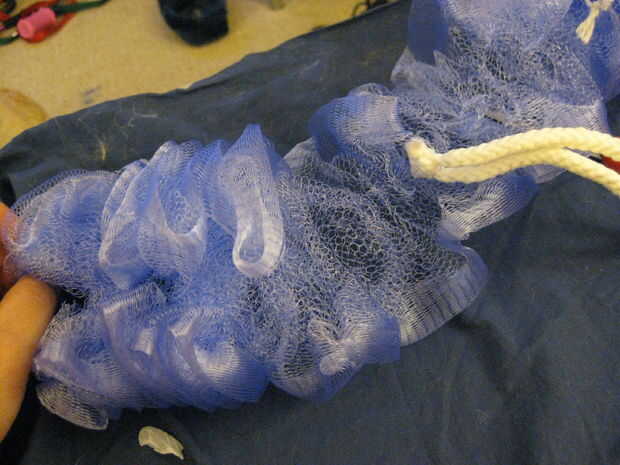 Cortar el lazo que mantiene unida a la esponja de ducha de nylon, y usted debe conseguir un tubo de malla de nylon largo.