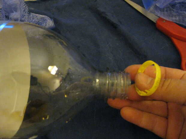 Quitarse el anillo de plástico alrededor de la base de la abertura de la botella. Tenga cuidado de no deformarla porque nosotros te lo pones de nuevo más tarde.