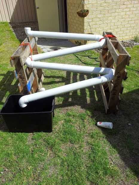 3. Use la cuerda para atar los tubos de PVC en el espacio aproximado en su plataforma. Verifique que los trozos de tubo de 90 * C sean capaces de emparejar para arriba y conecte bien. Recuerda gravedad deben tirar el agua hacia abajo en la tina grande en la parte inferior, así que imagínate que te estás haciendo un tobogán de agua malvados.