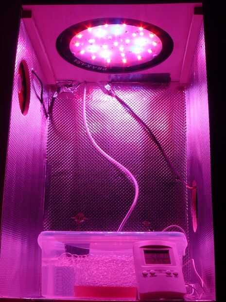 Instalamos ventiladores cuidados a la entrada y salida de aire en la unidad que funcionará las 24 horas. La matriz de LED está montada en un espacio en la parte superior de la unidad que tiene un recorte para permitir solamente la luz a través. La lámpara LED es una matriz de LEDs de 5W de tipos específicos. Tenga en cuenta que no todas las lámparas de crecer se hacen igual. Intenté baratos, caros y hasta algunos extraños pero al final fue con los de abajo. Utilice las especificaciones LED abajo y comparar a la lámpara que usted está comprando para el éxito.