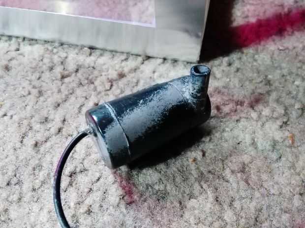 La bomba que fue rescatada de una fuente de mesa que encontré en una tienda de segunda mano. Luego había soldado la bomba a un viejo cargador de teléfono de 5 voltios.