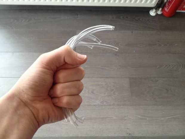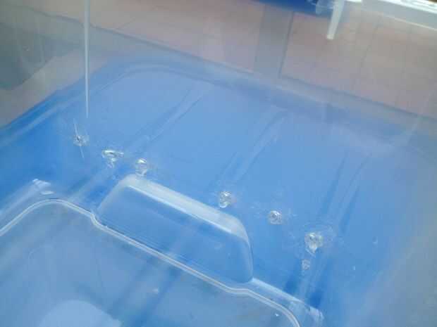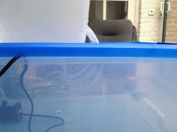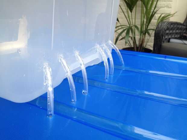 3. Ponga los seis tubos en cada agujero, conectar el "Pots" con el "depósito". Desde mi tubos no encajaban exactamente en los agujeros, tuve que pegar allí. Yo no pegue los agujeros de la tapa porque no hay riesgo de agua llegue a ese punto.