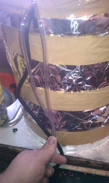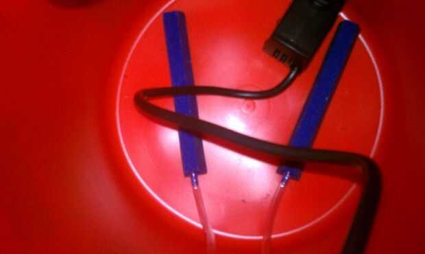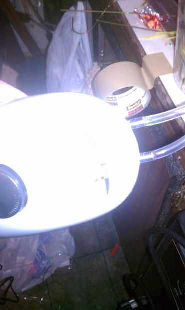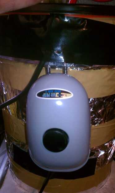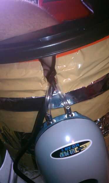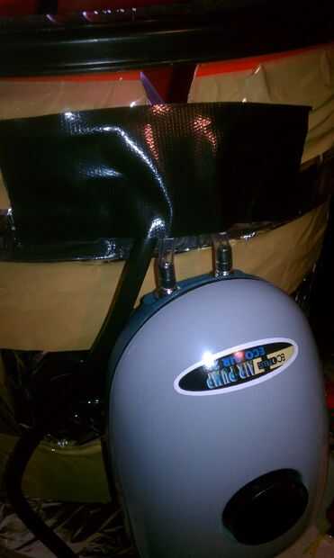Tire de las líneas de aire en el cubo para que tu bomba de aire está colgando alrededor de una pulgada de la parte inferior del agujero. Usar la cinta gorila (mejor cinta everrrrr) las líneas de aire y cable a la bomba en su lugar. Poner otro trozo de cinta gorila sobre el agujero así. Esto debe sellar el agujero y mantener su bomba colgando sosteniéndolo.