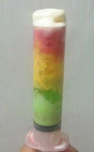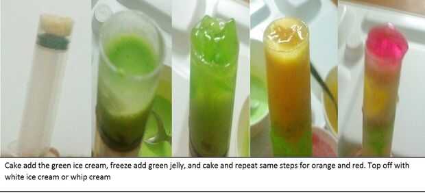 Las capas del hielo tráfico Jello Push Pops va como este - círculo de la torta, helado verde, congelar, círculo verde, gelatina y pastel, helado de naranja, congelan, jalea de naranja, pastel, rojo helado congelado, jalea roja, pastel y finalmente blanco helado o montar nata.