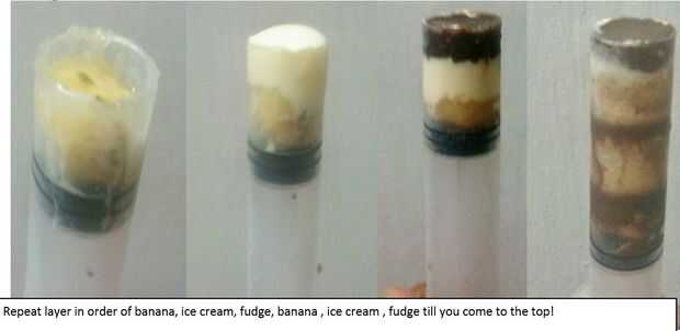 Para Fuggy hielo plátano Push Pops las capas son rebanada de plátano, helado de vainilla, congelación, fudge!