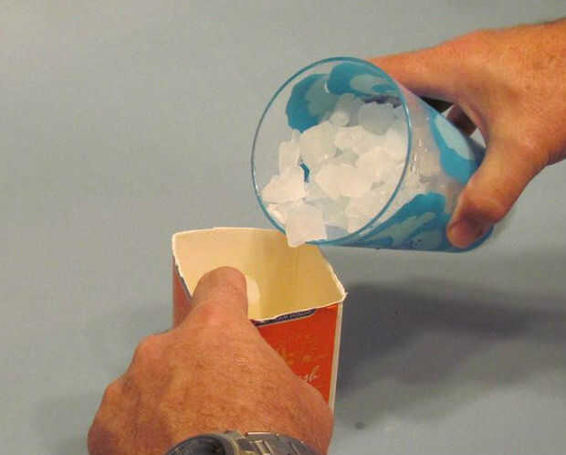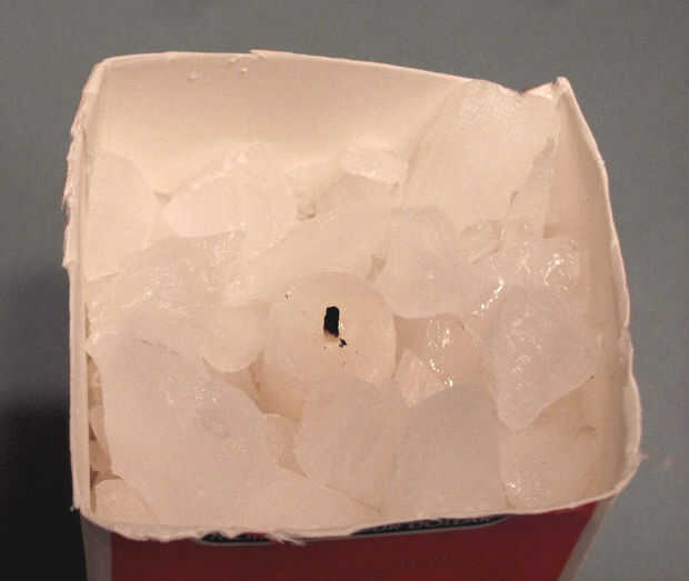 Si usas un molde más grande, puede ser aceptable usar cubitos de hielo en una bandeja, pero utilizando grandes trozos de hielo puede crear una vela que es el aire más que la cera y no muy atractivo o largo pasado. Mis trozos de hielo eran aproximadamente 1/2 a 3/4 pulgadas en un lado.