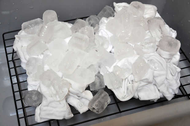 A continuación, cubre todo en hielo. Utilizamos una bolsa de 7,5 libras de hielo en cubos regular en la tela y aproximadamente la mitad una bolsa en la camisa y mameluco.