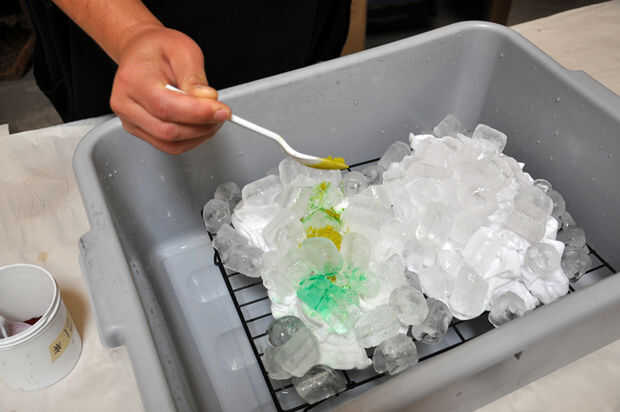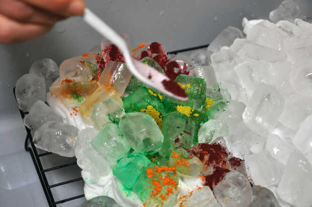 Agarra su primer color y empezar a rociar el colorante en polvo en el hielo. Ser tan aleatorio o tan específico como quieras con cómo se propaga el tinte. Recuerde, ya que los colores de los derretimientos de hielo se mezcla y mezcla como golpean la camisa. Si se ponen amarillo y azul juntos, usted conseguirá tan verdes. Por otro lado, parte de la diversión es que "mezclar" colores se dividen un poco en sus colores componentes, dándole efectos aseados. Puede utilizar esto para su ventaja al elegir sus colores.