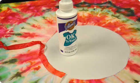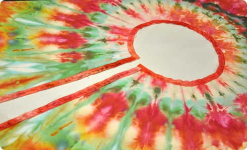 Ahora estamos listos para pegar en la cinta de rayón. Bolso teñido la cinta con algunos de los tintes rojos sobras porque queríamos una cinta roja, pero también puede incluir en el teñido de hielo, depende de usted. Colocar la falda en el suelo o una mesa donde podrá trabajar cómodamente y poner unos periódicos debajo de los bordes en caso de que el pegamento va a través.