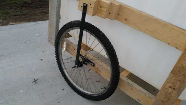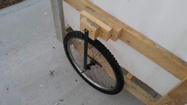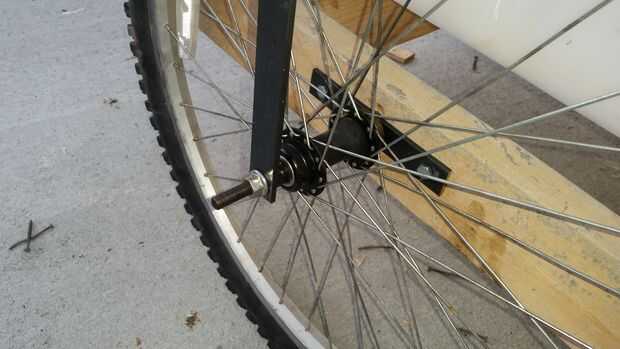 Ruedas de bicicleta están diseñadas para ser compatible en ambos lados. Para esto usé una piezas más largas de 1 "x 3/16" bar corriendo verticalmente en la estructura superior de madera.