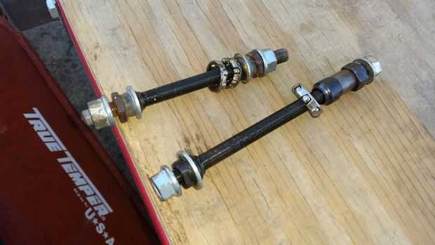 Para empezar la rosca en esta moto fue inigualable en mi almacén de hardware local. No cualquier sabor de fino/grueso rosca estándar o métricas parece encajarán bien. Yo planeaba sólo tiene que utilizar un tornillo largo completo como un árbol. Una cosa importante a saber sobre cojinetes de rueda en una bici es que son un sostenido en lugar por una tuerca mecanizada especial. (véase la nota de la foto) Si la tuerca especial sólo hilos sobre el perno de eje original entonces lo único que podía (rápidamente, fácilmente y barato) usar las ruedas de la bici era utilizar sólo el hardware original.
