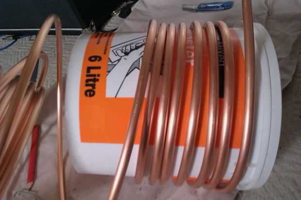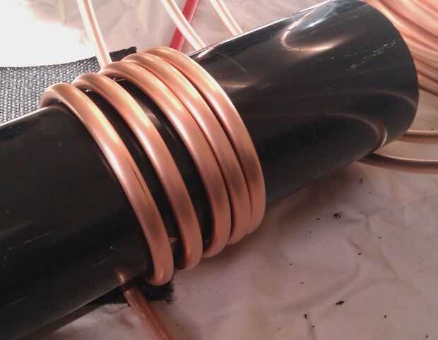 Utilizando un tramo corto de tubo 4" la bobina del media puede ser formada doblando el 10mm cobre alrededor del tubo. Hacerlo lentamente para evitar que se doblen el tubo, cuando se han formado 12 a 15 bobinas corte la bobina de cobre del y deja 300mm o así como una cola para el montaje.