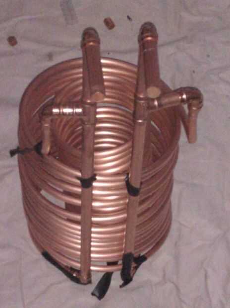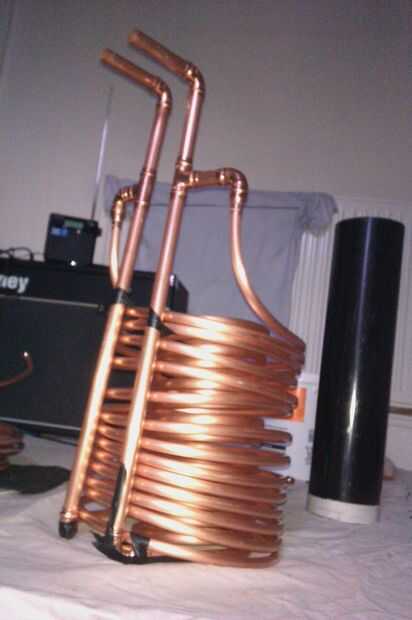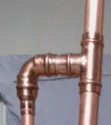Seco montar el enfriador, el flujo y regresar tubos colocando un codo en la parte inferior de una de las longitudes de 350mm de 15mm de cobre a la parte superior de este agregar una guarnición de t tales que T conexión offset tot al lado. En el otro el otro extremo una longitud de 100mm de tubo de cobre y forma un codo en la parte superior añadir una longitud final de 100mm para formar una cola que se puede conectar el refrigerador a la manguera. En el puerto de T la longitud de 35mm de cobre y fijar un segundo codo.