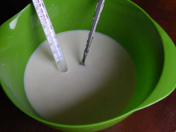 En un bol, agregar las 2 tazas restantes de agua tibia o leche (110-115F) (microondas 40-45 segundos puede ayudar a su líquido llegar). Agregar los restantes 2 1/4 de cucharadita de levadura seca. Agregue 1/2 taza granulado de azúcar. Vierta a la solución de levadura de arranque. Póngala a un lado.