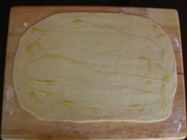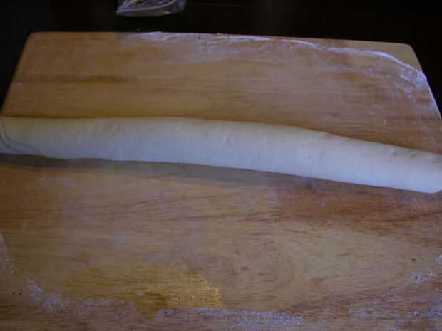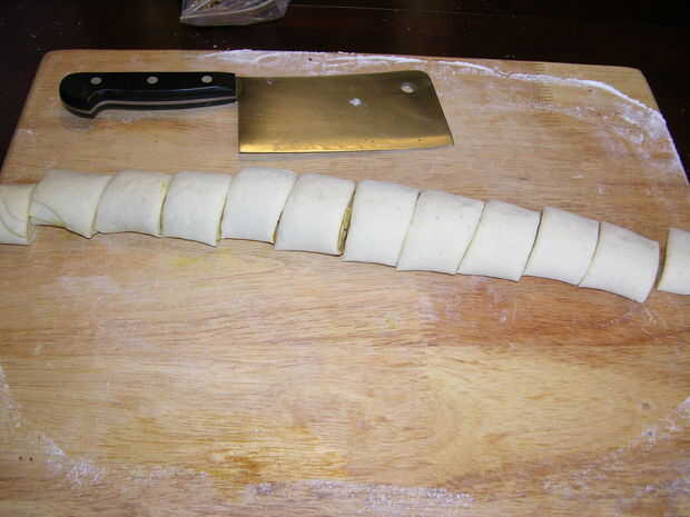 Enrollar la masa a lo largo de un extremo largo y dividirlo uniformemente en 12 rollos.