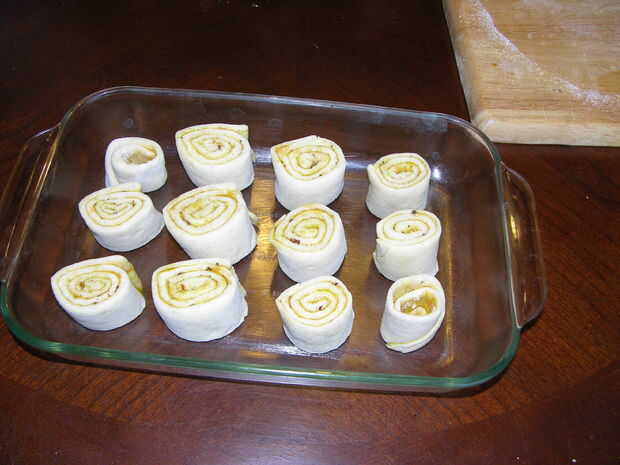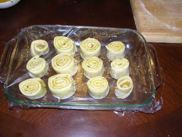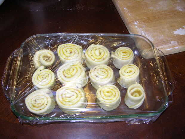 Una vez que los rollos de hecho probar, quitar la envoltura plástica que cubre la cocción plato. Hornear durante 20 minutos.