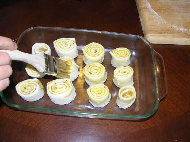 Cepille la parte superior de los rollos con la yema de huevo batido para que los rollos tienen buen color cuando al horno.