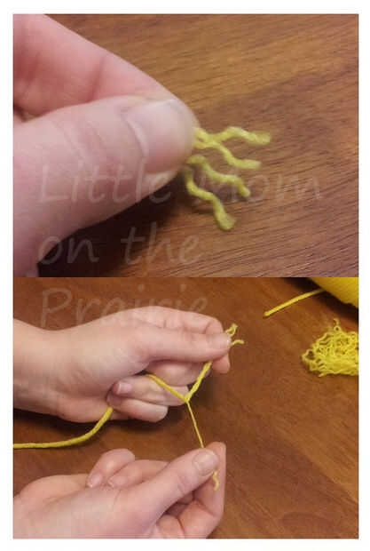 2. corte tiras de hilo (coloca en mi brazo unas cuantas veces luego corte ambos extremos). Fray un extremo y agarre una de las piezas. La idea es separar los filamentos. Pero por lo menos un filamento enseñado mientras tira con el otro. Esto evitará que el hilado agrupar para arriba en usted.