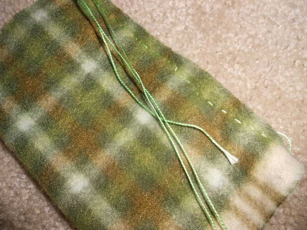 Su paño grueso y suave del doblez vertical. Asegúrese de alinean los bordes, pero no tiene que ser perfecto. Corte una porción larga de la seda del bordado. Colócala en la aguja y hacer un nudo en el extremo de la seda. Empuje la aguja en la esquina del extremo largo doblado del vellón. Cosa las puntadas de funcionamiento a partir de la más corto no dobla abertura, puesto que el extremo largo doblado no es necesario que vaya a coser. Las puntadas deben ser no mayores de 5 mm. continuar cosiendo hasta que tenga una breve apertura izquierda.
