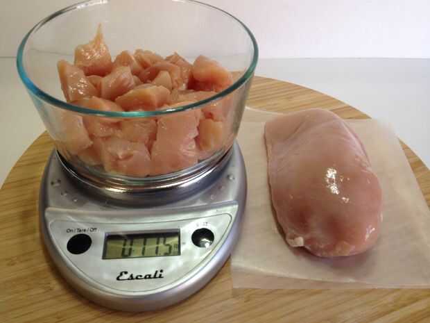 Se necesita 1 libra de pechuga de pollo y cortar en trozos de 1 pulgada. Una libra es generalmente mama 2 o 3.