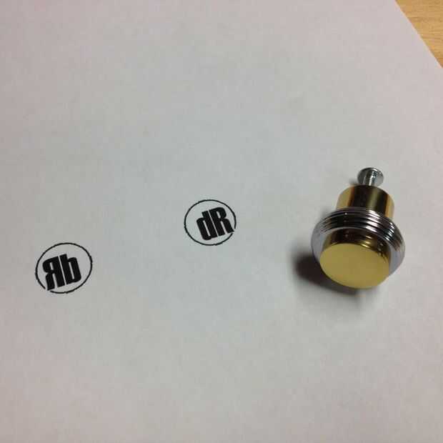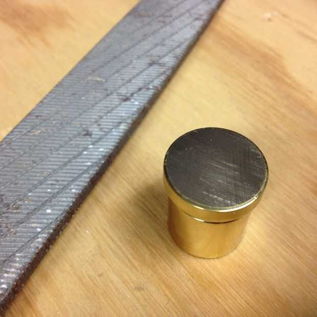 Así que encontré esta pequeña perilla de latón en el recipiente de separación en la ferretería. Era sólo $1 dólar. No estaba segura si era sólido o en a latón plateado, pero lo compré porque era plano y redondo. También tenía algunos hilos de corte en un extremo para que finalmente puedo montar esto en el extremo de un mango. Hacia fuera el paquete y ver que viene en tres piezas separadas. El extremo plano fue ligeramente redondeado, y para obtener una marca incluso, la marca debe ser perfectamente plana. Usé una lima plana y aplanar la superficie del latón.