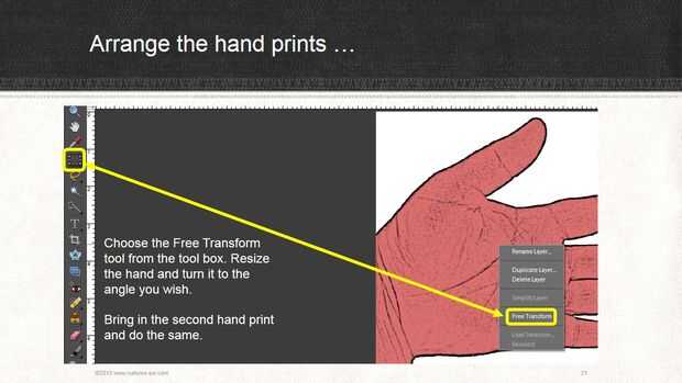 Hacer todos estos pasos nuevamente para otra parte. Traer esta imagen de mano también en el documento de la camiseta. Otra vez, transformación libre, esta mano de la imagen a la posición y tamaño que usted desee.