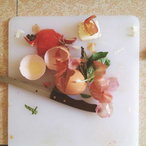 Me gusta usar el tiempo de cocción para hacer un poco de limpieza. Después de una buena comida lo último que quiero hacer es un fregadero lleno de platos. Esta receta utiliza platos mínimo así que limpiar no deberían tardar más de 10 minutos. Compost restos de su comida, limpiar el contador y lavar la tabla de cortar, tazón de fuente de huevo y cuchillo.