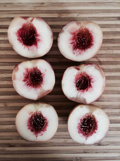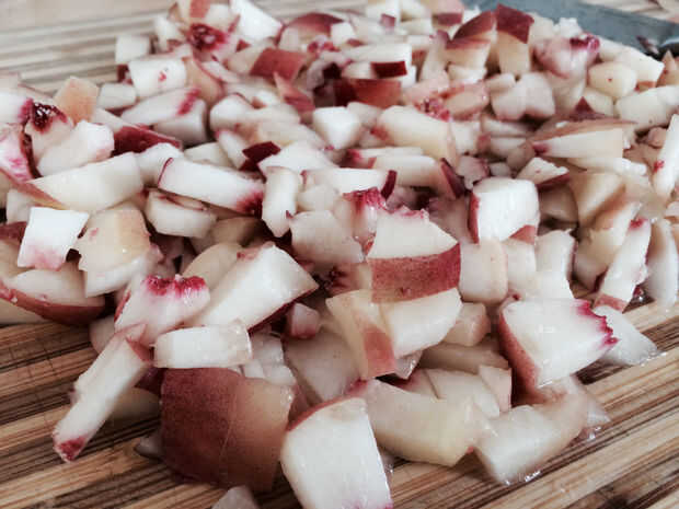 2) picar los melocotones; unos pulsos en un procesador de alimentos hace brevemente el trabajo de este.