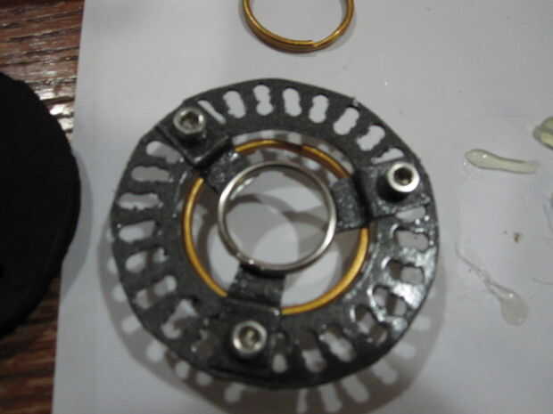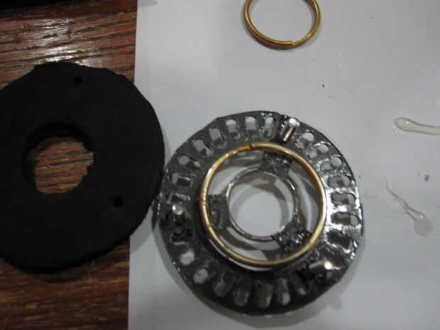 Los 3 llaveros de color oro / cobre se sentará para que cada anillo es más pequeño en diámetro y se sienta en más futuro dentro del reactor de arco al acercarse el anillo central. Coloque el centro, anillo más pequeño empujado la espuma y luego el siguiente tamaño se sienta encima de la espuma. El más grande de oro / cobre llavero realmente consigue super pegado o caliente pegado a la parte inferior de las piezas de chapa doblada de antes. A continuación, alinee el anillo medio con agujeros de cortar a la espuma negra y cortar los agujeros para los tornillos a sentarse a la espuma. Añadir pegamento para mantener en su lugar.