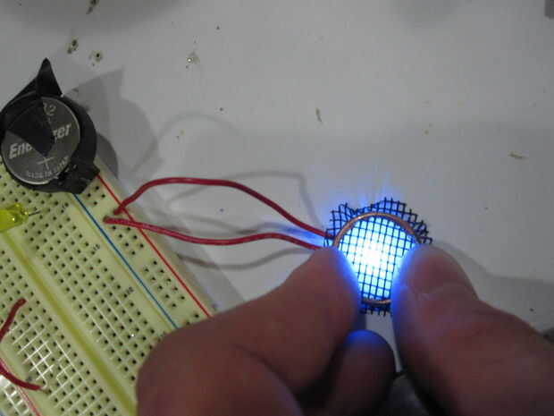 Utilice la impresión del diseño del reactor de arco para trazar un círculo en la negra 1/4" grosor espuma apenas lo suficientemente pequeña como para caber dentro del molde de la pulsera. También trazar un círculo del tamaño del aro más pequeño. Cortar este trozo de espuma hacia fuera y póngala sobre la placa trasera. Debe alinearse con su LED y quieres hacer una "zanja" en la espuma para los cables que van desde la batería hasta el anillo de LEDs debajo de esta espuma cuando se sienta en su lugar.