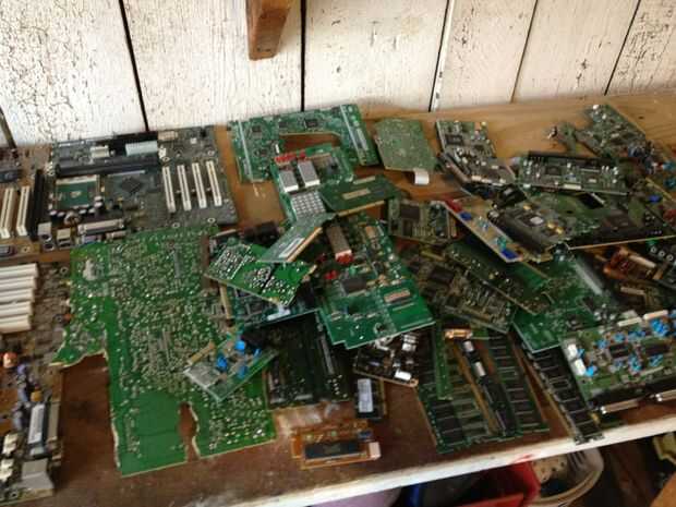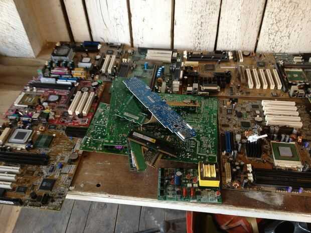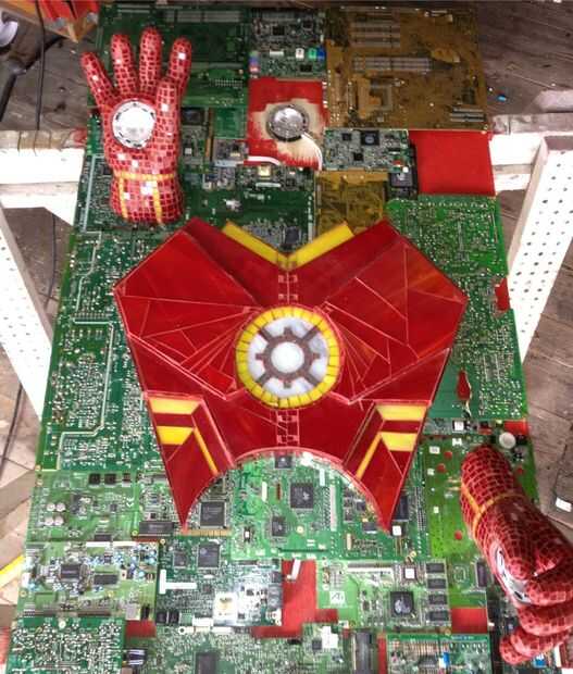 Para realmente resaltar la influencia de tecnología de Iron Man, decidí utilizar placas madre y otras cosas de la computadora como fondo de la pieza. Mi hijo, Nate, rompió unos 10 ordenadores, impresoras y cintas de correr y saca todos los componentes electrónicos. Los pedazos principales entonces se atornillan en la madera contrachapada, tablero de respaldo. Piezas más pequeñas fueron pegados en las otras partes electrónicas para dar una mayor ◊Beautiful 3-d... Una vez que todos los componentes del equipo están asegurados, las piezas planta son atornilladas y pegadas a la pieza con clavos de líquido.