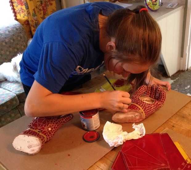 Después de la lechada seque, aplicamos una pintura base de agua rojo oscuro a la lechada. Esto le da a la pieza un color más profundo en vez de una mirada de "Rosa". Gracias Ana por tu ayuda. Este paso requerida pasar por cerca de 2 rollos de toallas de papel como fue limpiar la pintura y luego limpiar inmediatamente. Si la pintura se sentó a tiempo se convierte en trabajo difícil conseguir de los vitrales.