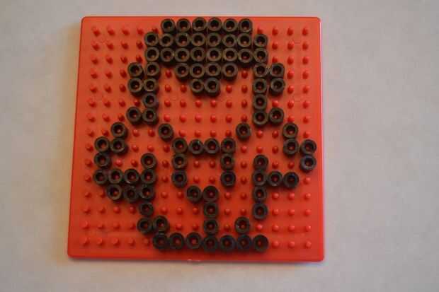 Empecé colocando todos mis granos negros abajo. Yo desordenado sobre la colocación del grano en las áreas de la mano para que no deposite sus cuentas como la mía. Coloque el contorno y luego rellene el negro en el interior durante el siguiente paso. Trabajar de arriba a abajo para evitar golpear los granos de sus clavijas.
