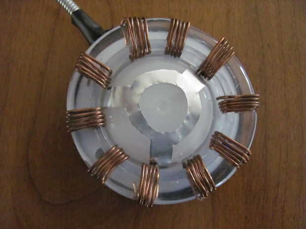 4. ahora tome la lámpara (sin la cubierta de plástico) y coloque la tapa de la pierna de la silla / difusor y colóquelo en el centro del círculo. Tomar el anillo de paraguas que tiene el cobre envuelto alrededor de él y puesto alrededor del difusor. Ahora tome un pedazo de papel de una bandeja de papel de aluminio y cortar un círculo con 3 puntas, para añadir a la decoración y el lugar que en el medio. Ver imagen a continuación para ver cómo debe. Ahora caliente pegar todas las piezas de cuando está satisfecho con cómo se ve.