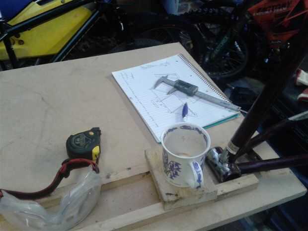 Hice una plantilla de madera para los soportes inferiores a. Esto fue utilizada para mantener los marcos en la alineación pero también permitió los marcos para diapositivas y pivote, por lo que he podido conseguir los marcos a la distancia correcta entre sí y en el ángulo deseado. Me aseguré que la plantilla era totalmente plana con un nivel de burbuja para que los tubos superior también podrían alinear usando el nivel de espíritu. Hay algunas cosas a considerar en este punto como ángulos diferentes marco afectará las posiciones de conducción de ambos pilotos. En mi opinión lo más importante a tener en cuenta es la distancia entre el capitán y acompañante... no quieren montar con la barbilla de alguien en la espalda y del mismo modo la persona detrás de quiere ver algunos paisajes – no la espalda sudorosa! : P