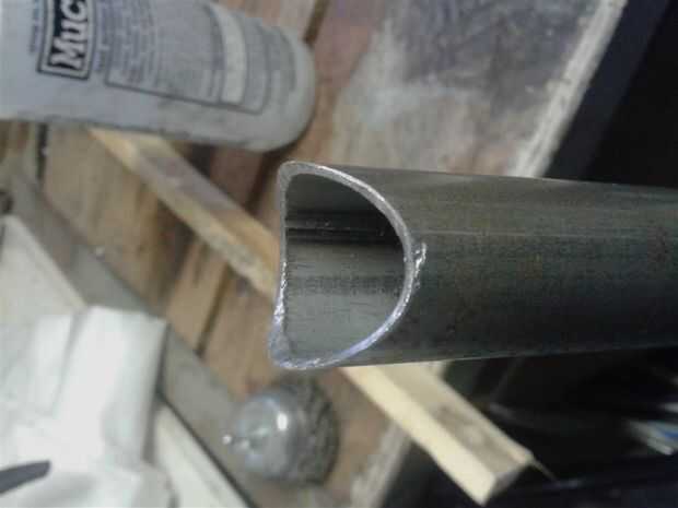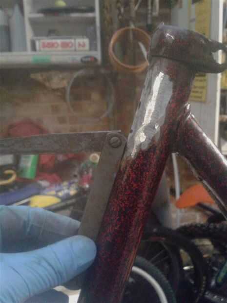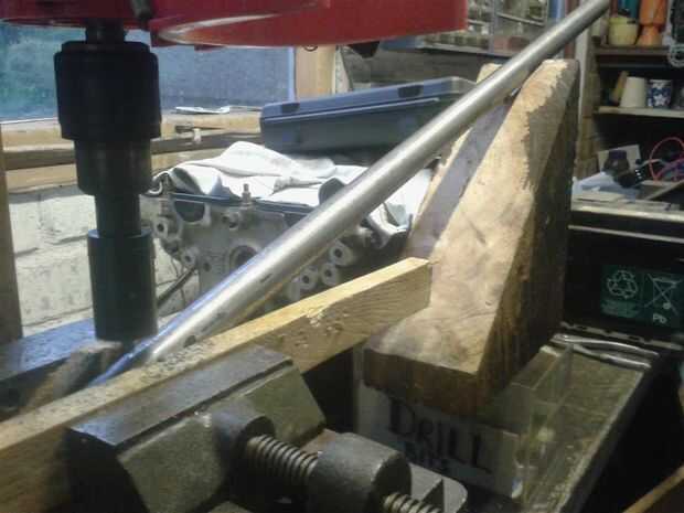 Una vez que esté satisfecho con el marco colocándolo es tiempo para cortar la nueva tubería para el marco. Compré una pieza de 3 metros de tubo de acero de un distribuidor de chatarra un montón. Para cortar los extremos de los tubos usé cortadores de agujeros que empareja el diámetro del tubo del asiento se está soldando para dar un buen ajuste al ras. Esto hará que sea ver limpia y asegurarse de que es una combinación sólida una vez soldada. Los ángulos de corte pueden medirse fácilmente mediante cualquier cosa que gira – dos palos clavados juntos en sus extremos funcionaría si eres desesperado! Como se puede ver que utiliza un juego de galgas. Una vez que han medido el ángulo en su maqueta de marco, se puede utilizar esto para determinar el ángulo de corte entre el taladro y el tubo. Encontré que era difícil empezar a taladrar en un ángulo como la broca se deslice fuera del borde del tubo. Para superar esto que he utilizado un punzón para hacer un pequeño guión en el tubo de acero. Luego hice un pequeño agujero de perforación vertical. Esto proporciona una superficie decente para el taladro a morder sobre una vez inclinado en un ángulo.