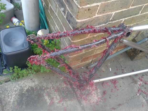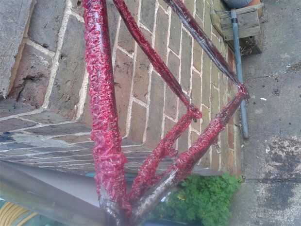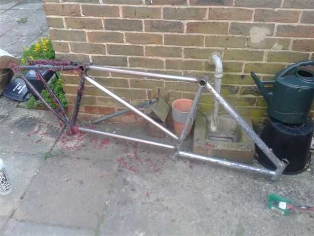 Le dan un rápido arena hacia abajo una vez seco y preparar para la pintura.  Material tejido o cinta adhesiva abajo cualquier bits no desea pintado, tubo principal, pedalier, sostenedor de botella de monta y tubos del asiento.  En caso de pintura sobre ellos será mejor a la arena una vez su seco que intentar limpiar apagado cuando ha mojado como acabarás manchando la pintura o conseguir polvo o la suciedad pegada en él.