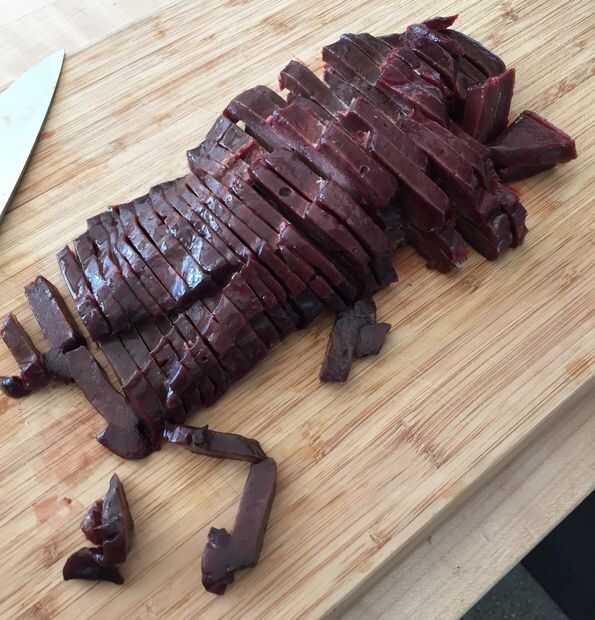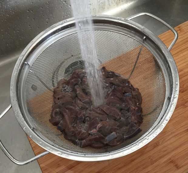 Cortar el hígado en tiras finas y enjuáguelo con agua. Si el hígado está congelado, enjuáguelo con agua tibia se encenderá en cubitos de hielo de leche hígado durante el siguiente paso y no se empape. Aquí, estoy utilizando una libra (~ 500 g) de hígado.