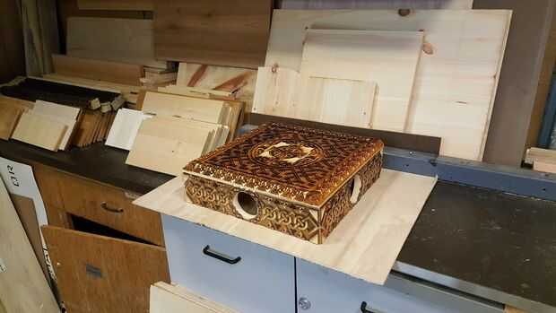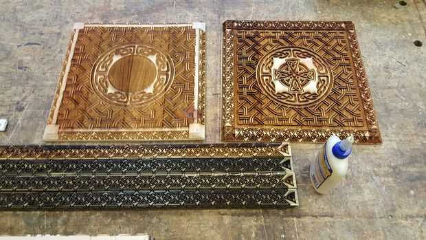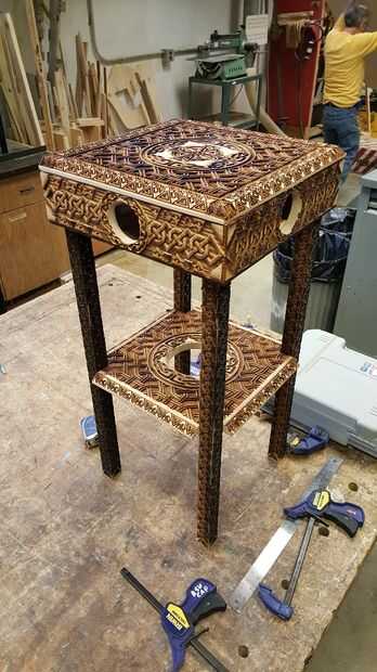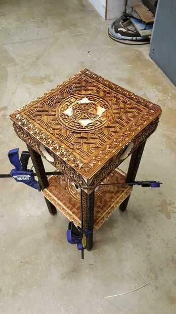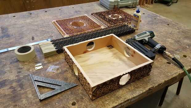 Lo primero que quería hacer era construir la parte del pecho de la mesa así que las paredes y uso que una sierra para crear cortes en ángulo de 45 grados a cada lado. Se adelantó y trajo otro aspecto de mi trabajo en juego: cazadores de sueños. Quería incluir este tipo de trabajo en la tabla, ya aunque el aspecto geométrico jugaría bien en el diseño de trabajo de nudo céltico. Para ello que los orificios perforados en el espacio que quería recortar y luego usa un jig Sierra para cortar lentamente hacia fuera de los círculos. Después de eso lijarles hacía lisa. Para tejer el atrapasueños en el lado de la madera tenía que perforar pequeños agujeros en la parte exterior de la abertura del círculo.
