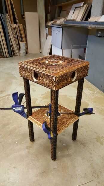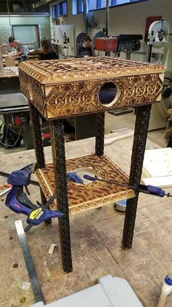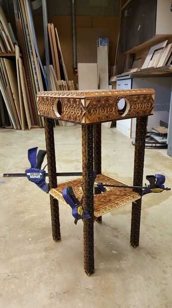 En este punto todo me quedaba hacer era bisagra de la tapa a las paredes de tabla, las piernas del embutido y Unido el estante. Fui por delante y decide que la mejor ruta sería embutido las patas a las paredes hacia arriba mediante el láser de corte inferior. La mesa fue luego articulada a las paredes. La última parte fue fijar la plataforma a las piernas. Estaban pegados, clavados y afianzado con abrazadera juntos. Todo se encontraba a la Asamblea; por lo tanto, todo lo que quedaba era dejó las pinzas hacer maravillas y deje que se seque.