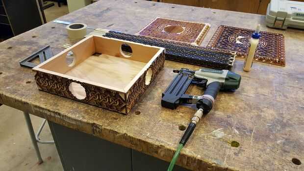 Después de cada uno de los corte pongo las paredes junto con pegamento para madera y una pistola de brad. Luego, movido de un tirón sobre las paredes y el corte de madera contrachapada de abedul de 14 "x 14" y pegamento y había clavado en las paredes.