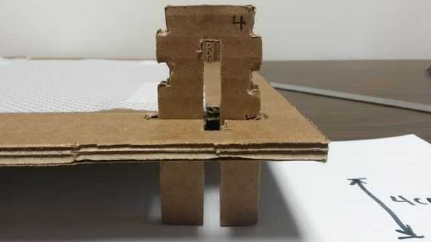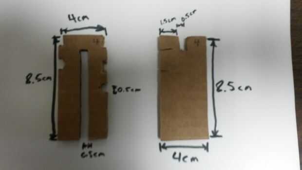 3. Deslice cada pieza con el orificio grande cortar fuera del centro en la ranura de 4,2 cm de cada cruz para que la pequeña muesca en su borde se alinee con la base de cartón.