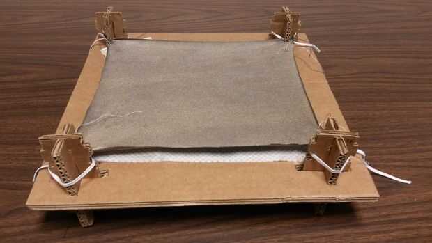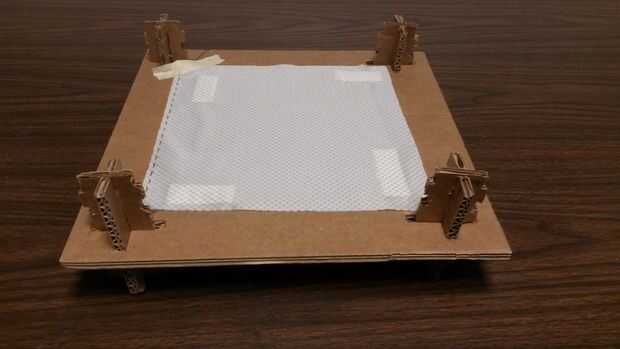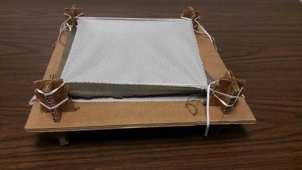 3. Colocar la otra hoja resistente arriba, otra vez, atando las bandas elásticas a las patas del soporte. Asegúrese que el lado con el hilo conductor en la parte superior.