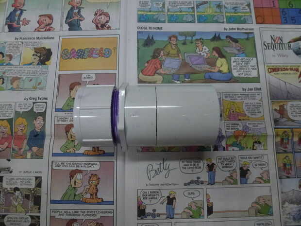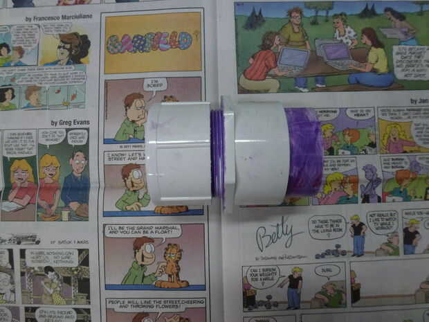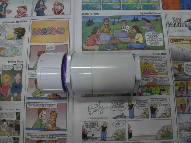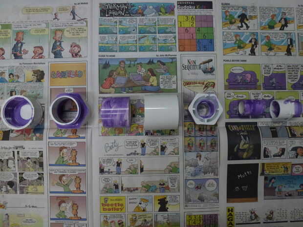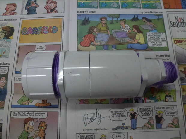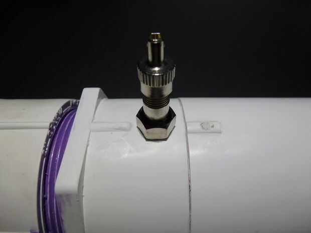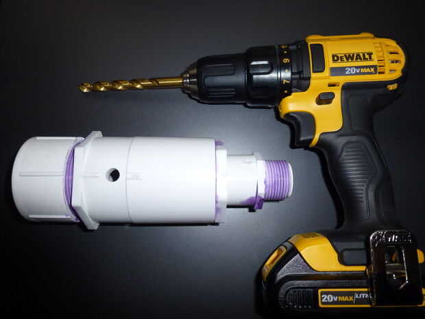 Para el tanque, comience por oscurecimiento de las piezas de PVC. Tome el casquillo de extremo de PVC de 2" y péguelo a la 2" adaptador macho de PVC con cemento de PVC. A continuación encolar el 2-1/4" sección 2" PVC tubo al adaptador macho. Pegamento del PVC de 2" resbalón de acoplamiento a la tubería de PVC de 2". Luego pegue el buje de PVC de 2"- 1" a la hoja del acoplamiento. A continuación pegue la sección 1-3/4" de 1" PVC pipa en el manguito. Por último, pegar el 1" adaptador macho PVC 1" PVC tubo y fijar el tanque a un lado para dejar que se seque. Después de que el depósito está seco perfore un orificio piloto en la parte inferior del tanque y luego aumentar tamaños de brocas para un orificio de 3/8". Utilice una llave para la válvula shrader en el orificio de 3/8".