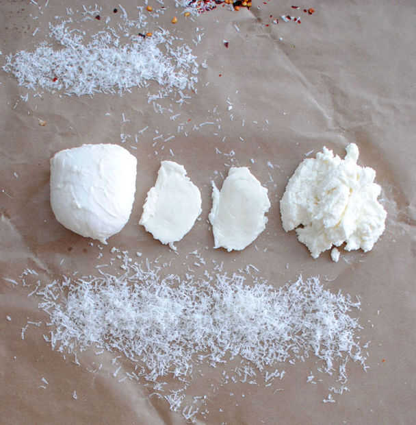 Tengo un montón de opciones para la mozzarella fresca por aquí, así que eso es lo que usé. La clase de bajo contenido de humedad envasada que consigue en el supermercado está bien aquí.