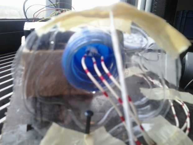Plástico de la botella: cortar la botella 5 cm debajo de la tapa de la botella. (Ver imagen). Hacer un pequeño agujero en la tapa de la botella y poner el sensor de temperatura a través de él. (Sensor exterior, conectores dentro de la botella) La soldadura de tres presas en el sensor de temperatura, por lo que puede conectar a la pan-Junta, véase también la figura del circuito. Este sensor de temperatura medirá la temperatura húmeda. Poner algunos kit de ácido libre en el agujero para que ningún agua puede venir de fuera a dentro. Hacer un pedazo de tela alrededor del sensor de temperatura con el hilo.