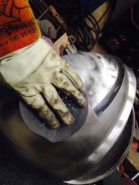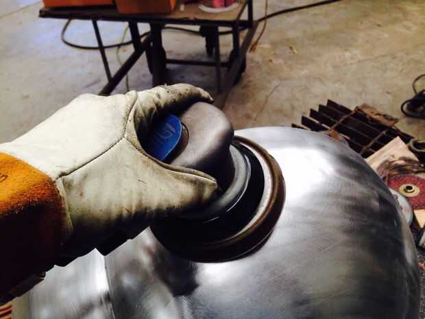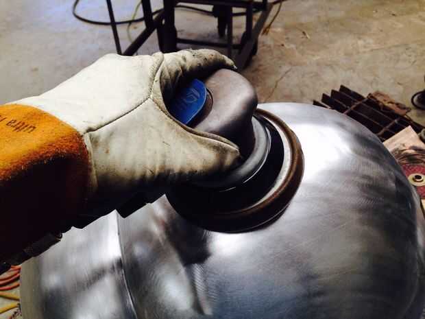 Después de todo de las soldaduras estaban vestidas, un 5" random orbital (DA) fue utilizada para unificar la pieza y eliminar la direccional marcas de pulido. Empecé con grano 80 y subido a un disco de grano 120. Después de toda la pieza uniforme, la mano termine la escultura con un cojín de la mano de grano 80. Acabado con un abrasivo grueso sobre rayas más finas de la mano crea una agradable profundidad en el metal y realmente da una escultura de un rico, sentir a mano. Puede ser sin embargo un agujero del conejo, así que saber cuándo parar o podría pasar días frotando la cosa!