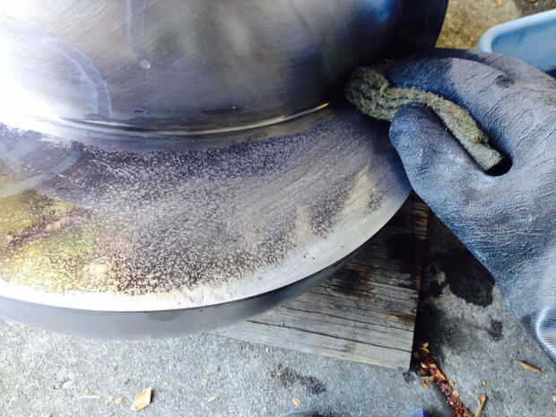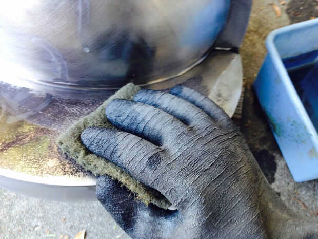 No había mucho escala de molino a la izquierda en el acero, pero lo que allí se necesitaba retirar antes de que se podría aplicar una pátina. Si nunca has probado pulido la escala apagado, usted sabrá que es difícil, tedioso y lento va. El ácido muriático se tira rápidamente y deja una superficie áspera y gris que posteriormente puede ser lijada. Ácido muriático es ácido clorhídrico y se utiliza sobre todo para tratar y limpiar la mampostería y hormigón. Es extremadamente peligroso y pueden causa graves quemaduras químicas tan ser seguros al usarlo. Una solución diluida hace un poco menos nudosas para trabajar con, por lo que he añadido un par de onzas de ácido a un cuarto de galón de agua. Siempre agregue el ácido al agua, no el agua al ácido. El ingrediente que se está agregando para que salpique cuando se introduce el segundo ingrediente. Mejor que el agua salpica hacia fuera que el ácido! Utilice guantes de goma y en un área bien ventilada como los gases son fuertes. La solución ácida puede aplicarse con un cepillo de cerdas naturales o una especie de cojín de la mano. Frotó ligeramente la pieza con un scotch brite para ayudar a aflojar la escala de molino, como el ácido disuelto lo. Cuando la escala se ha ido, bien enjuagar la pieza y secarla inmediatamente para minimizar la oxidación. Almacene cualquier solución ácida sin usar en un plástico o recipiente de vidrio y bien utilizarla en una fecha posterior o disponer de un almacén de materiales peligrosos.
