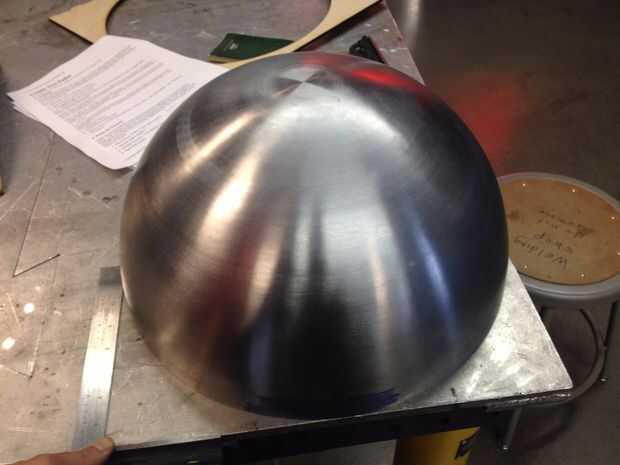 Gran parte de mi trabajo en los últimos años ha sido conformada por secciones esféricas de metal que se fabrican para crear formas sugerentes de la naturaleza, el cosmos o cualquier cosa que me habla. Pre formados metal hemisferios están disponibles como surtido artículos en una variedad de tamaños, desde empresas de Wagner - http://www.wagnercompanies.com/spheres_and_hemispheres.aspx o formación comercial de Metal - www.cmforming.com. Las piezas proporcionadas por estos fabricantes son die formado y sobre todo están libre de herramientas marcas a excepción de un pequeño agujero centrado. El inconveniente es que no fabrican hemisferios entre 12" y 30" de diámetro. Para dimensiones entre 12" y 30" necesita ser hecho girar las piezas. Yo he estado trabajando con RW Metal Spinning en Hayward, CA desde hace varios años y contratado para hacer tres 16" hemisferios para esta pieza. El video en este paso muestra Roy Gonzalez Sr. girando una pieza de aluminio en su tienda. Grandes chicos.
