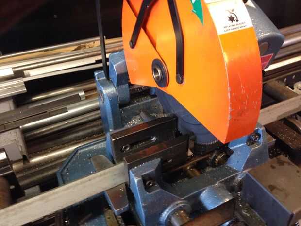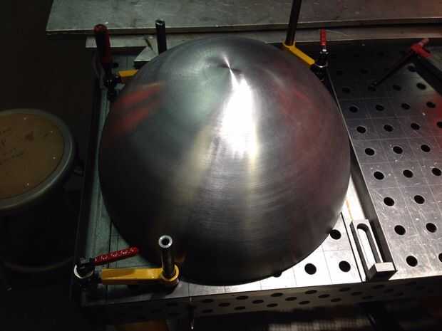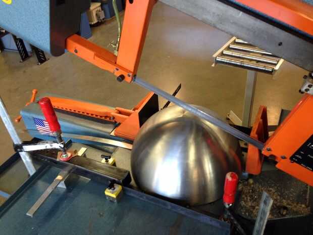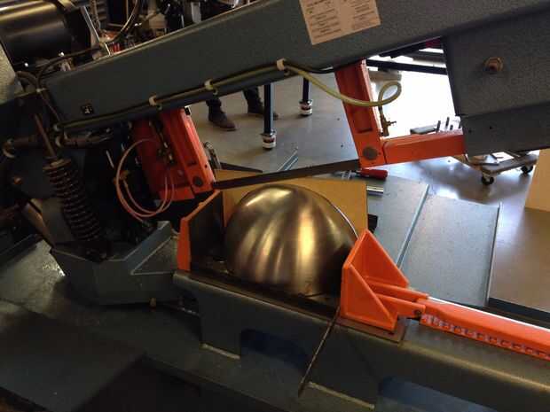 Esta escultura compone tres hemisferios, cortado y montado en dos esferas compenetradas a 270 grados (que es una frase complicada pero no estoy segura para describirlo) y cuatro patrones. Uno de los hemisferios debe cortarse por la mitad y la sierra en el taller de Pier 9 era la herramienta perfecta. La sierra permite que un 16 1/4" de largo corte con una profundidad de garganta de más de 8". Construí un jig de ángulo de hierro, soldada con autógena del hemisferio para el ángulo y fijar la pieza en su lugar. Un laser corte patrón fue utilizado para ayudar a alinear la hoja para atraviesan la pieza. Era un perfecto "corte de vaquero".